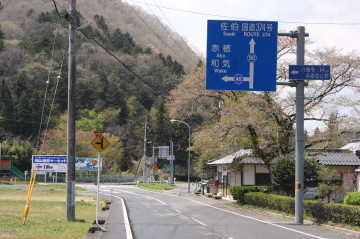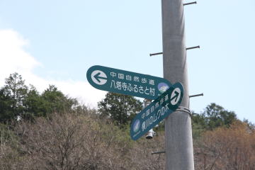 県道46号線を進みしばらく行くと八塔寺ふるさと村に続く中国自然歩道を案内する標識が… |