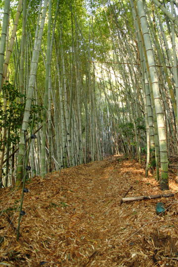 登山道をわずかに行くと防鹿網が張られていてるのでこれをくぐる。 やがて登山道は竹林の中を進むようになる。 |