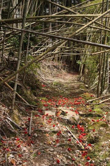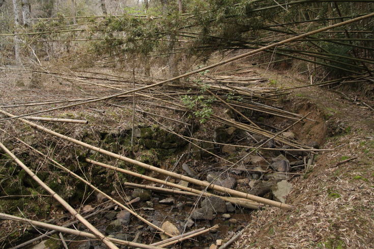 十王堂跡が近づくにつれ中国自然歩道は倒木ならぬ倒竹がご覧の通りの状態だ。 |