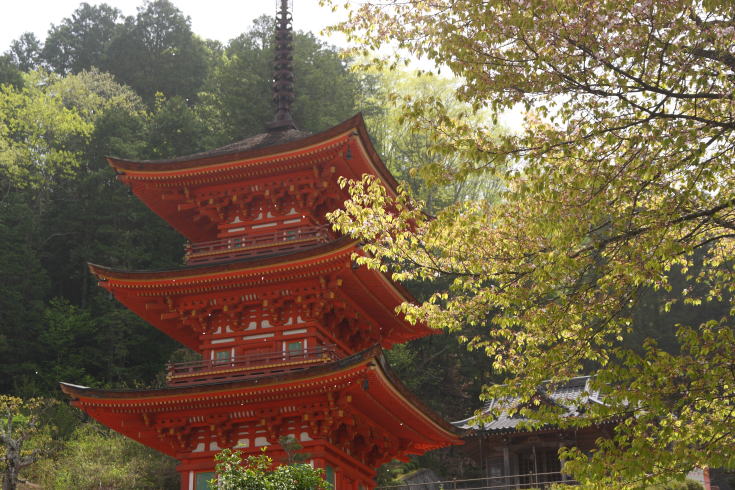 長福寺を案内する福本交差点を左折して自転車を漕ぎ続けると、やがて山裾に鮮やかな朱色の三重塔が現れた。