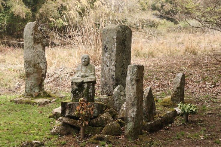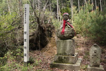 目印を追って忠実に林道に引き返したあと大休止。 未舗装の林道を左側に回りこむとアスファルトの立派な舗装道路が延びているのでこれを下る。 20分ほど下ると舗装道路と分岐して左手に遊歩道が始まっているのでこれを辿る。 そして遊歩道に入るとすぐに赤いマフラーを巻いた禁度地蔵が… |
