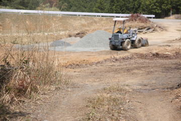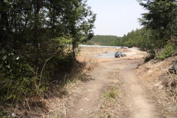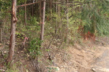 十王堂跡から5〜6分も歩けば林道分岐に至り、これを左折して道なりに進む。 やがてご覧のような工事車両が現れた。 山頂へはこの林道を左折して20〜30mほど進み、 ピンクの測量テープに導かれてクマザサと潅木のヤブに突入する。 |