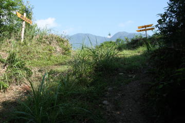 444.4m三角点への分岐 (AM9:08) 本道をはずれ三角点の案内板に誘われこれを進む。 (後日、これが正規ルートだと教えてもらいました。) |