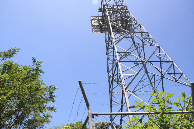 フェンスの南東の角付近に立つ三角点 ここで大休止 コンビニで買った山かけそばを頂いたあと山頂をあとにした。 (AM11:30) |