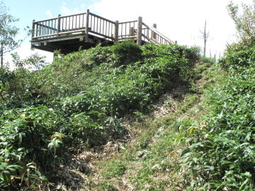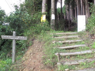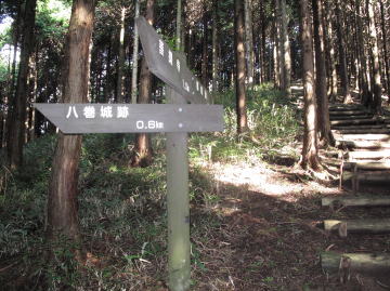 八巻城跡分岐上段 (AM8:17) 歩きはじめてわずか30分少々だというのに、長い長い階段は 山歩きから1カ月以上も遠ざかっている身体にはホントきつい。 |