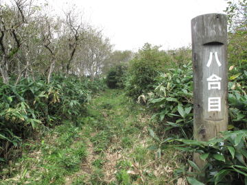 1,010m峰の五合目を過ぎて一気に下るとそこが六合目だ。 林道を左に0.4Km行けばBコース五合目に、 右に3km行けば黒尾峠に出る。 そして直進すれば那岐山山頂まで1.7kmの距離だ。 |