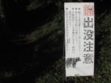 登山口に立つ 『熊出没注意』 の看板 「朝と夕方は特に注意しましょう。」と書かれている。 (熊鈴は必携ですよ。) |