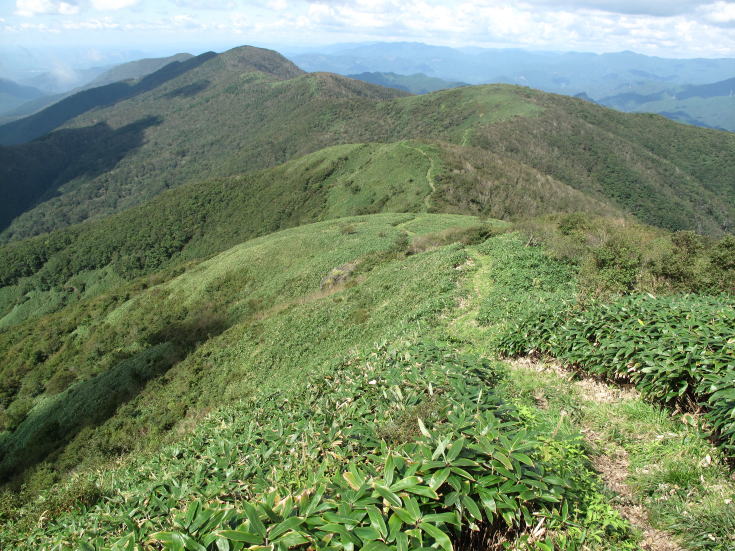 東屋の脇から続く稜線登山道 これから目指す山形仙は遥か向こうに霞んでいる。 ようやく今スタート地点に立ったようなものだ。 それにしてもすばらしい景色です。 |