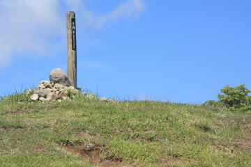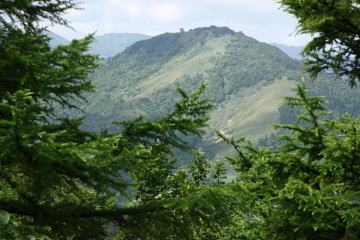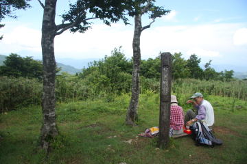 山頂からは樹間からわずかに南西方向の山が 望めるだけで展望はきかない。 |