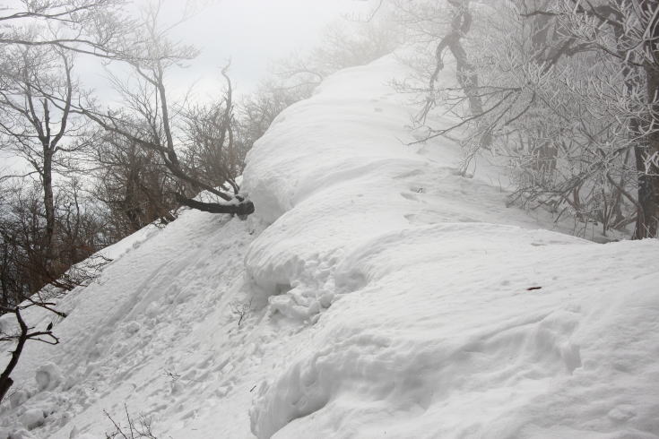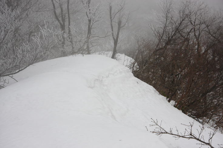 視界の悪い積雪の縦走路を白馬山に向かいます。 |