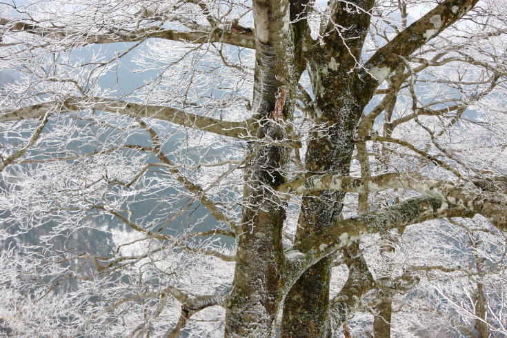 積雪期、青空に映えるブナ林の樹氷は、それはそれは美しいです。