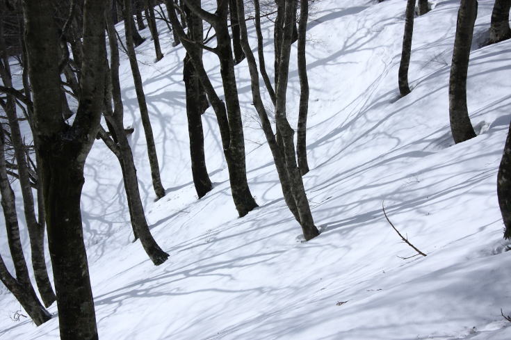 積雪のブナ林 六合目辺りからツボ足では膝まで沈みこむようになり、たまらずスノーシューを装着。 |
