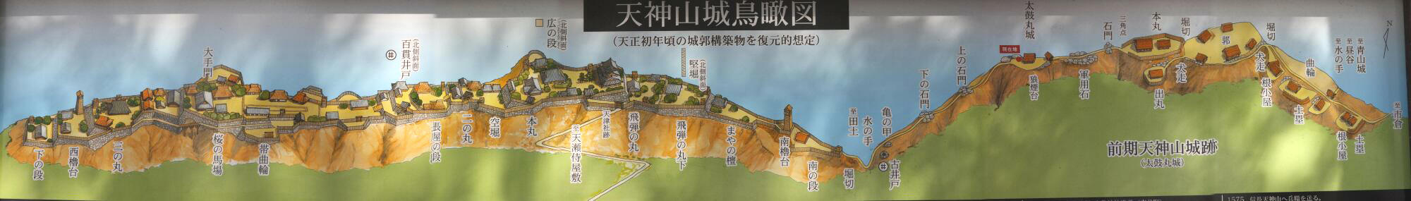 太鼓丸城址に立つ天神山城鳥瞰図 上の画像にマウスポインタをどうぞ。 途中見晴らしの良い太鼓丸城址で大休止。