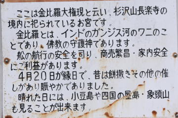 途中、金比羅大権現の案内板に導かれ寄り道してみました。 金比羅ってガンジス河のワニのことだったんですね。 |