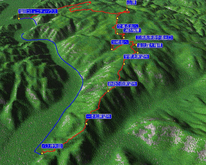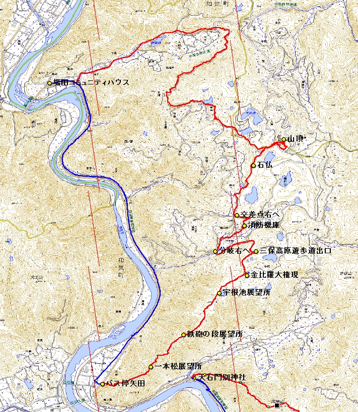 下山はさらに北上して中国自然歩道を経由して塩田までの約18kmを歩こうと思います。 まずは自転車を塩田バス停近くにある塩田コミュニティハウス(旧片上鉄道塩田駅跡地)にデポして、 三保高原遊歩道の起点となる矢田バス停まで車を走らせました。 |