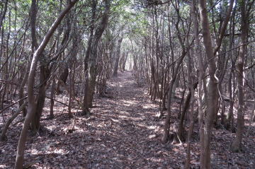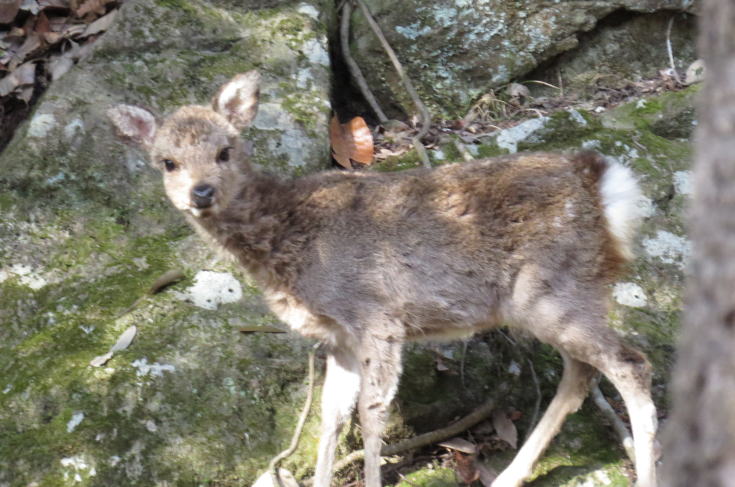 階段を上って少し進んだところで、かわいい目をした小さな子鹿に出会いました。 あわててカメラを向けましたが、ピントの甘いこの写真を一枚撮らせてくれただけで、 アッという間に森の中に消えて行きました。 |