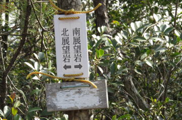 沢伝いに登り何度も渡渉を繰り返すうち、やがて地形図の『峠』に辿りつきました。(AM9:05) 峠には左の写真の標識があり、ここを右折して東観音寺山へ・・・ 数分で『分岐』に至り、右折して南展望岩に向かいます。 |