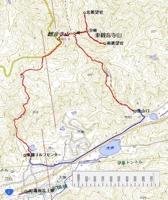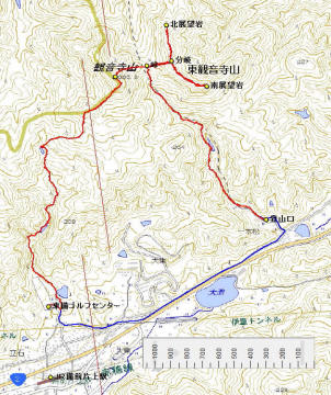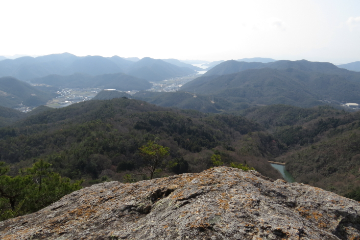 | 山頂からは歩いてきたばかりの東観音寺山の両方の展望岩が一望できます。 下山は東片上方面に進みます。山頂からは他に北に伸びている登山道があるので間違わないように・・・ 途中、登山道は西の池ルート、三の池ルート、尾根ルートに分岐しますが、どのルートを選んでもまた合流するようです。 ちなみに今回は三の池ルートを下山しました。 |