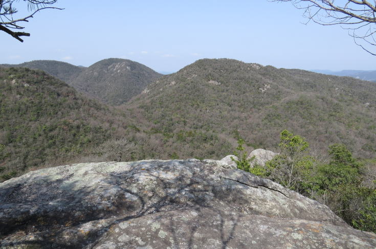 来た道を分岐まで戻り、今度は北展望岩に足を運んでみました。 こちらは西〜北〜東の展望が広がっていますが、やはり南展望岩に比べるとちょっと寂しいかな。 再び『分岐』を経由して『峠』に戻り、観音寺山に向かいます。 峠を過ぎて一気に下ったあと登り返すのですが、この直登が結構キツイですね。 |
