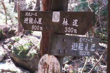 やがて登山道は渓流コースと尾根コースに分岐しますが、 どちらも馬の背小屋で合流します。 ここは尾根コースへ… |