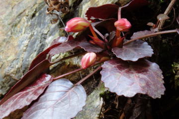 標高800m辺りまで下るとお目当てのイワウチワが咲き始めていました。 まだまだツボミが多く、見ごろはまだ数日先ではないでしょうか。 |