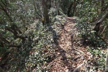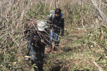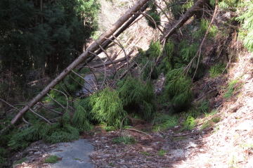 林道まで下山するとご覧のように伐採された ヒノキが至る所で道を塞いでいますので、 気をつけて通過しましょう。 |