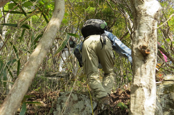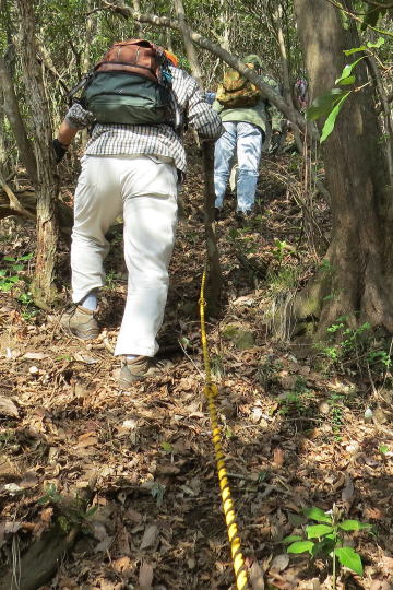 標高400m辺りからとんでもない急峻な直登がはじまる。 とても山歩きというレベルではなく、潅木を掴みながらよじ登って行くと言ったほうがいいかもしれません。 |