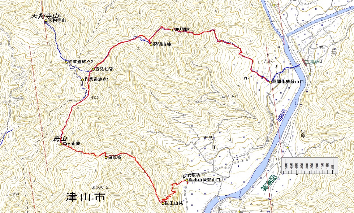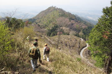 山岳地形を巧みに利用した中世山城、医王山。 中世山城では珍しい石垣を多用した防塁。本丸から二の丸・三の丸への通路も完全復旧し、 自慢の大堀切も見ることができます。 今年より医王山城を援護する4つの山城城郭群をつなぐ縦走ルートが完成し、 埋もれていた遺構を見ることができるようになりました。 戦国時代、宇喜田・秀吉が攻めて落城しなかった医王山城。 眺めは最高で津山市内を一望できます。 (以上、医王山城保存会の案内チラシより抜粋) 津山市のナカガミ氏(このルートを完成させた方)に誘われて 4月29日、津山市の医王山城保存会主催の梶間山城〜吉見仙砦〜烏ヶ仙城〜塩屋城〜医王山城 という5つの城跡遺構を巡る縦走登山に参加しました。 |
