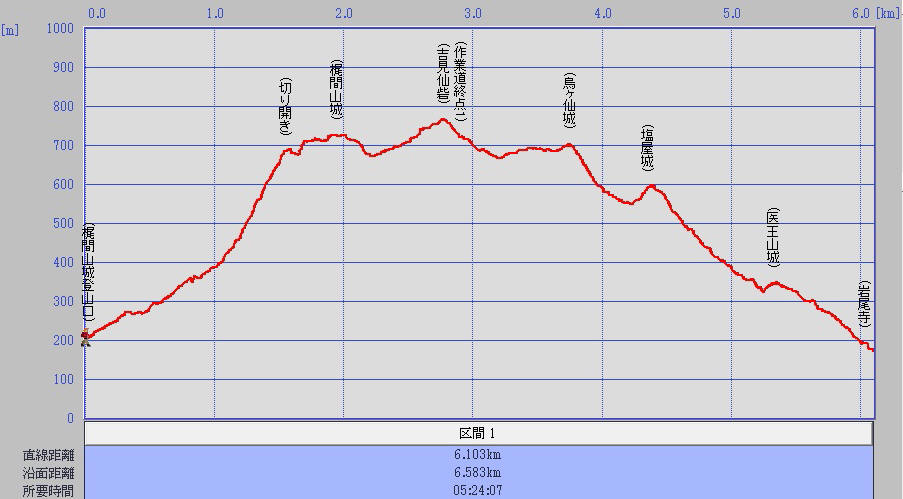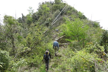 縦走路には案内板や目印のテープがありますが、決してやさしい山ではありません。 とても険しく、時間もかかることから、体力に自信のない方にはお勧めできません。 もしこのコースを歩けば、よくもこんなにハードな山に草刈機を担いで 開通させたものだと関心させられることでしょう。 縦走路を完成させ、案内状を下さったナカガミ氏に感謝いたします。 《参考》 2012.5.6 梶間山城跡〜烏山〜天狗寺山 |