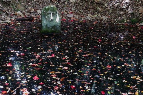 塩場の池に浮かぶ真っ赤なツバキの花 |