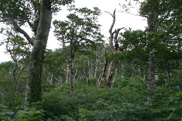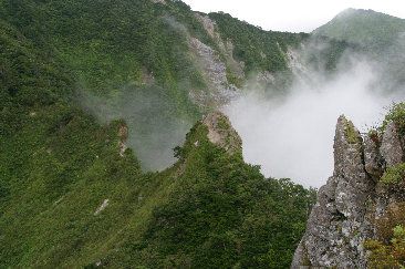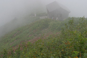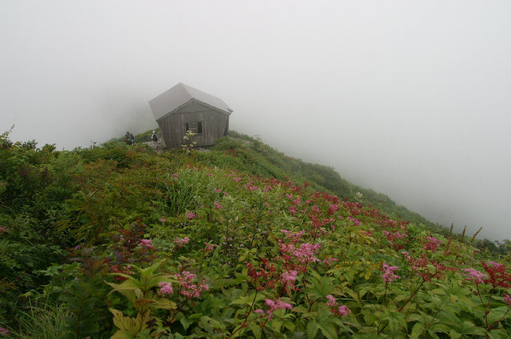ユートピアのお花畑は残念ながらすでに見頃を過ぎていた。それでもシモツケソウは十分目を楽しませてくれる。 前回同様ユートピアはガスに覆われ見晴らしが利かなかった。 ガスが消えたら三鈷峰まで足を伸ばそうと思っていたが、回復の兆しがなく諦めて下山した。 |