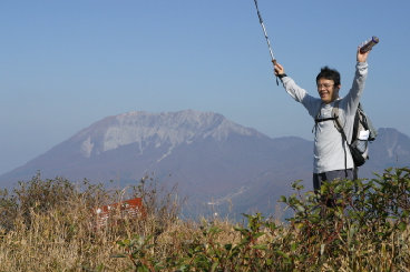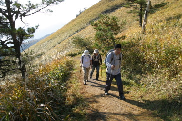 稜線に出ると山頂まで土塁の上を歩いて行く。 この土塁が岡山県と鳥取県を分かつ境界線らしい。 今まさに両県をまたぎながら歩いているのだ。 そう考えると実におもしろい。 ここまで来ると山頂は目の前だ。 疲れたら振返って大山をゆっくり眺めながら休憩すればいい。 土塁でアキノキリンソウを見つけた。 残念ながら他に山野草を見つけることはできなかった。 稜線に出て20〜30分で山頂に到着。 体調を心配しての山歩きだったSさん、おめでとう。 とうとう山頂まで歩きましたね。 |