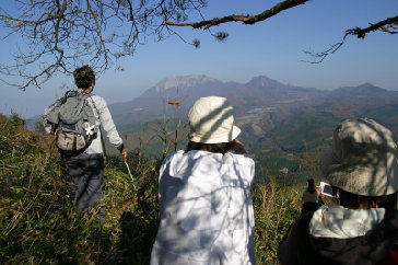 蒜山ICを出て482号線を西に向かい内海乢の県境を越えてすぐに左折する。700m程進むと林道川上2号線の標識を左手に見る。 林道を2〜3km進むとやがて登山口に到着する。 この山は今年の1月の積雪期に歩いて以来だ。 林道で車がスタックして身動きがとれなくなり、頭の中が真っ白になったのがつい昨日のことのようだ。 Sさんのご主人は今年体調をくずされ、回復してから初めての運動だということでずいぶん心配したが、病み上がりとは思えないほど足取りは軽快だった。 あとはこの山からのすばらしい眺望を4人で楽しみながら歩くだけだ。 |
