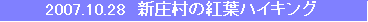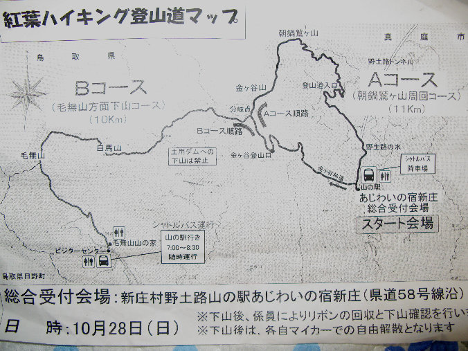 今日は新庄村主催の紅葉ハイキングに参加させていただいた。 受付会場の山の駅には早朝から大勢の参加者が集まり、用意された芋煮に舌鼓を打っていた。 受付で参加費の1,500円を支払い、お弁当・お茶・お土産のお餅を受け取った。 今回用意されたコースは金ヶ谷山〜毛無山コースと金ヶ谷山〜朝鍋鷲ヶ山コースの二つの縦走コースだ。 金ヶ谷山〜毛無山コースを選択した場合は毛無山のビジターセンターに車を駐車し、 シャトルバスで受付会場まで運んでもらえるのでありがたい。 しかし、今回は金ヶ谷山〜朝鍋鷲ヶ山コースを歩くことにした。 |