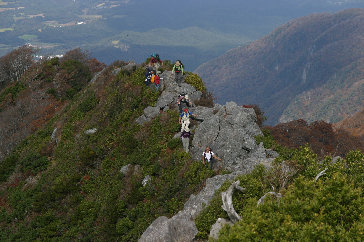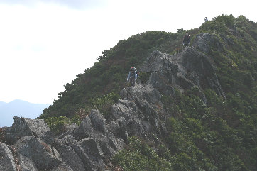 甲ヶ山山頂手前の岩稜帯。 次々に恐竜の背のような稜線を歩いている。 |