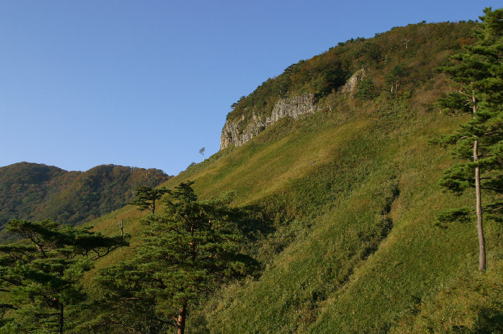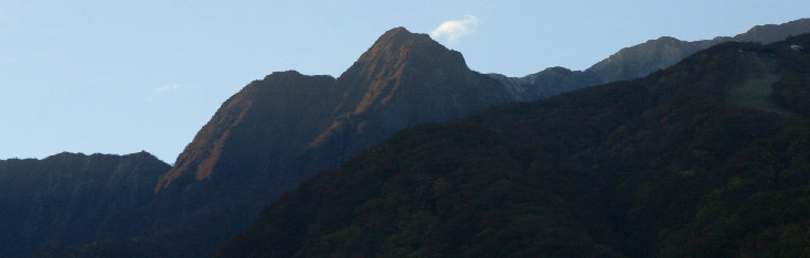 振返ると三鈷峰が夜明けとともに輝きはじめていた。 途中何度もアップダウンを繰り返し、ヘトヘトになりながらも約1時間で登山口に到着。 AM7:40 |