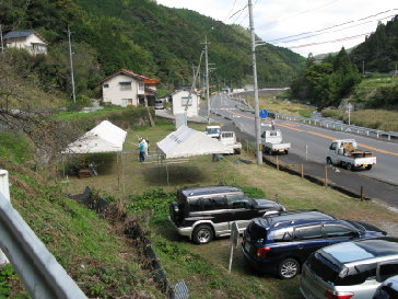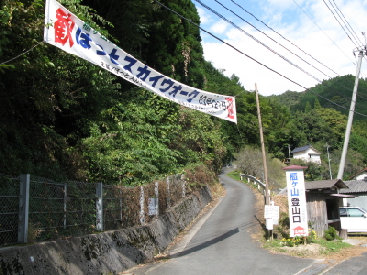 登山口に張られた横断幕 今年もたくさんの人がこの山の頂を目指すことだろう。 | 地元の方々が大会の準備をされていた。 | |||||||||||||||||||||||||||||||||||