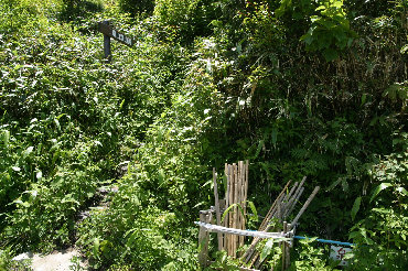 笠菅峠に到着 たくさんの杖が用意されています。 |