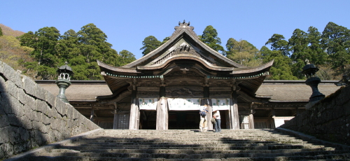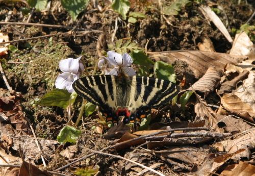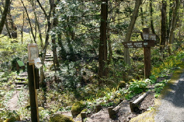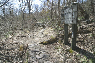 スミレを撮っていると、どこからともなくギフチョウが現れ、「さあ撮って」と言わんばかりにカメラの前で蜜を吸いはじめた。 しばらく歩くと遊歩道が突然石畳に変わる。 立札を見て1600年頃に建造されたものだとわかった。 古くから参道の一部だったようだ。 それにしても気持ちのいい山歩きだ。 GWだというのに夏山登山道とは対照的にほとんど人に出会うことがない。 登山道を独り占めしたような気分だ。 |