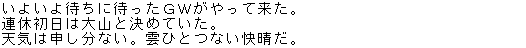 何度か大山に登っているが、いまだ剣ガ峰の山頂を踏んだことがない。 いや、踏んだことがないのではなく、踏めないでいるのだ。 象ガ鼻から天狗ガ峰へ高度を上げるにつれ、登山道は細くなり30cm程度になる所がある。 浮石がゴロゴロしているうえ、両サイドは垂直に切り立っているのではないかと思えるほどの崖だ。 おまけにつかまる樹木さえなく、まさに綱渡り状態だ。 足を踏み外せば間違いなく命はないだろう。 以前、途中まで登り断念したことがある。高所恐怖症の私はそれ以上足が前に出なかった。 以来、何度か夢でうなされることになった。 これから悪い夢を見ないよう、すべて払拭したい。今日は頑張って剣ガ峰を目指すつもりでいた。 |