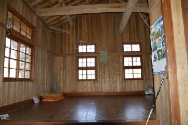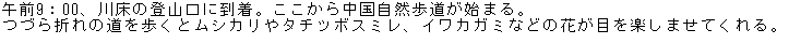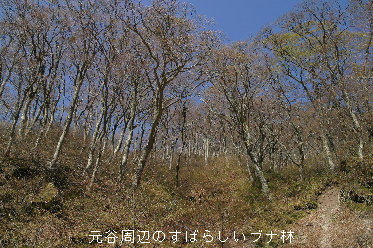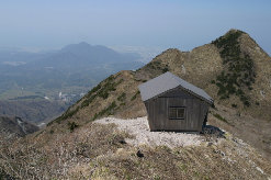 午前10:30、大休峠非難小屋に到着。小屋の中はけっこう広いうえ、とてもキレイだ。 ここから野田ガ山に向かうが、これまでの遊歩道とは違って登山道は細いうえ、低木の枝が張り出して行く手を阻み、半そでの両腕はスリ傷だらになった。 これからしばらく、気を抜けないヤセ尾根が続く。かなり緊張してきた。 |