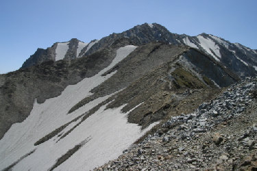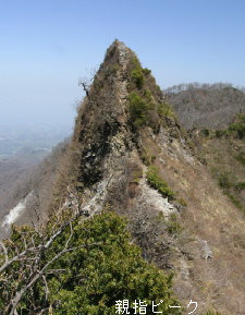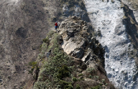 崩落が激しく、現在通行禁止になっている親指ピーク。 登山者がまさに今そのピークを越えようとしている。 あのピークを通過するのだ。 とにかく高所恐怖症の私にとっては一番の難所だった。 |