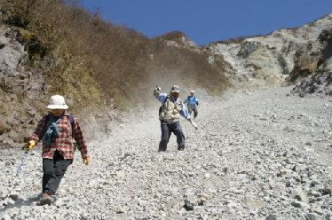 非難小屋で一緒になった倉敷から来られたご夫婦と高松の増井さん(一番後ろ)と一緒に砂すべりを下山。 おかげで楽しい山歩きができました。 倉敷のご夫婦は初めての砂すべりに不安だとおっしゃっていたが、一歩踏み出すと1.5m近くも進むのが気に入られたようで、奥さんは慣れるにしたがい快調に下山された。 ときおり音を立てて大きな石が土煙をあげて転がって来る。落石には十分気をつけなければならない。 |