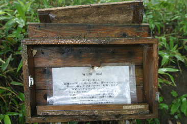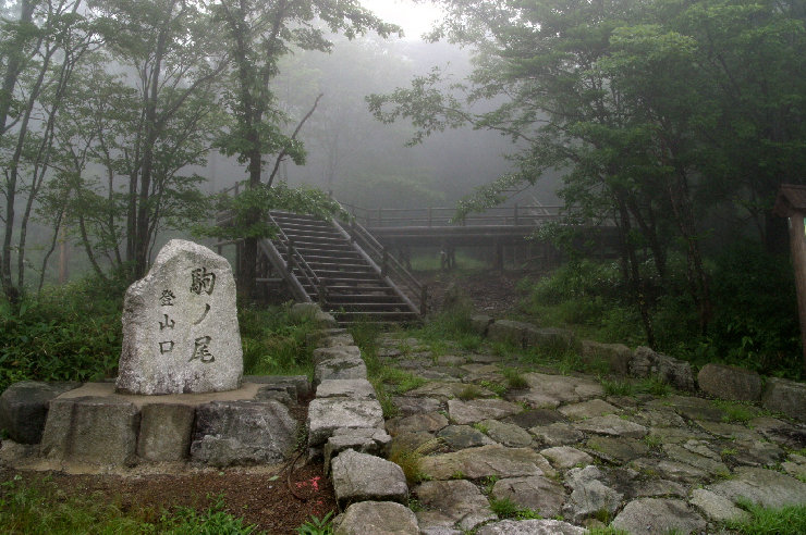 AM7:20 駒ノ尾山登山口に到着。 広い駐車場には他に車はなかった。 登山口はガスに包まれている。 やはり雨になるのだろうか。 身支度をしていて熊よけの鈴を忘れたことに気がついた。 マズイ! 後山一帯には間違いなくツキノワグマが生息しており、これまでに何度か足跡を見かけたことがある。 熊に遭遇することがないようにと祈りながら階段を登り始めた。しばらく行くと「貸し出し用熊鈴」と書かれた木箱を発見。 ラッキーと思いながら中を覗くが熊鈴は一個も入っていない。 木箱には「使用後必ず箱に戻してください。」とある。 心無い人がいるものだ。 とても寂しい気持ちになったが、気を取り直して歩き始めた。 |