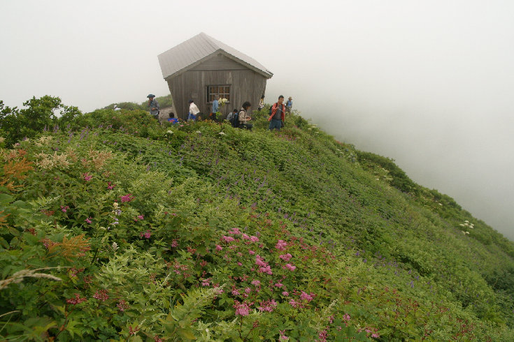 ユートピア非難小屋付近のお花畑はすでに見頃を迎えていた。(9:50) しかし、稜線上では猛烈な風が吹き荒れ、ガスで展望も利かない。 非難小屋で食事を済ませて天気の回復を待つことにしたが回復の兆しなし。 後ろ髪を引かれる思いでユートピアを後にした。 (10:50) この頃になると団体さんがどんどん登って来られ、登山道が渋滞し始めていた。 想像していた以上の登山客だ。登山道がまるでアリの行列状態になっている。 上宝珠越まで我慢の下山となった。 上宝珠越からの砂すべりは人も少なく、快適に下山することができた。 |