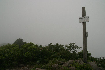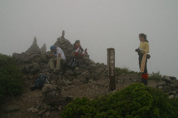 三鈷峰に到着 9:35 晴れていればすばらしい眺望なのに…。 |